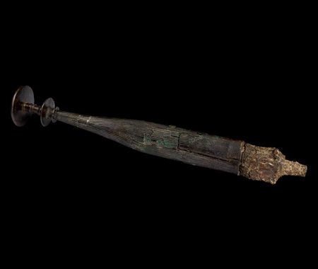 Spada a lama foliata e costolata con margini assottigliati, ancora inserita nel suo fodero in bronzo elegantemente decorato a sottili incisioni a 'V' e desinente con un grande pomello circolare, preceduto da una serie di dischi di differenti dimensioni