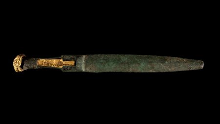 Spada in bronzo con impugnatura provvista di alloggi per l'inserimento di altro materiale, oggi con elementi in oro antichi decorati a rosette ma verosimilmente non pertinenti; lama foliata
