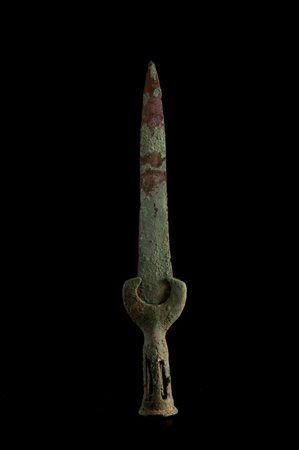 Pugnale con immanicatura in bronzo tornito e corta lama foliata triangolare in ferro