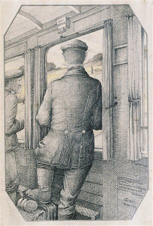 Lotto 408 Thomas Walch (Imst 1867 – 1943) Partenza per il fronte dopo la licenza, 1915;Matita, acquerello, 34 x 23,2 cm, in cornice