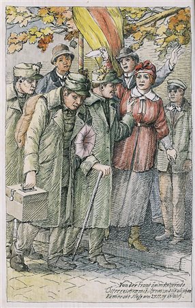 Lotto 409 Thomas Walch (Imst 1867 – 1943) Soldati austriaci in ritorno dal fronte, 24.11.1919;China, acquerello, 29 x 18,5 cm, in cornice