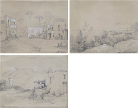 Lotto 419 Consalvo Carelli (Neapel/Napoli 1818 – 1900) Fuorigrotta Napoli, Lago di Agnano, Paesaggio napoletano, 1858;3 disegni, matita e biacca su carta applicata su foglio, ognuno 23 x 29,2 cm ca.