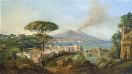 Lotto 422 Schule/Scuola von Posillipo Golfo di Napoli con il Vesuvio, 1850 circa;Olio su tela, 36,5 x 64 cm, restauri