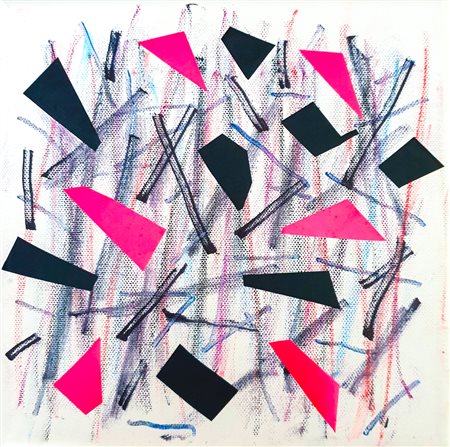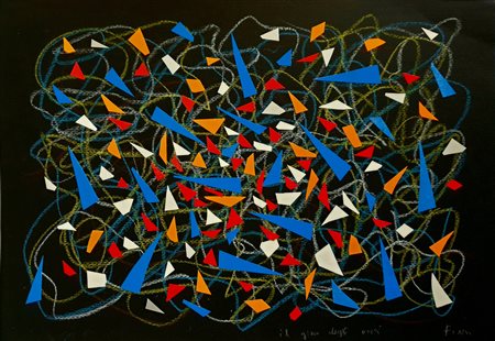 Collage e pastelli su cartoncino 27x24,5 cm; firma in basso a destra.