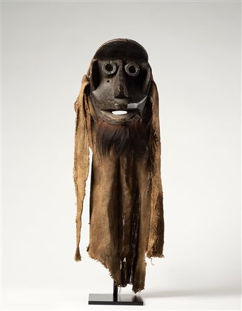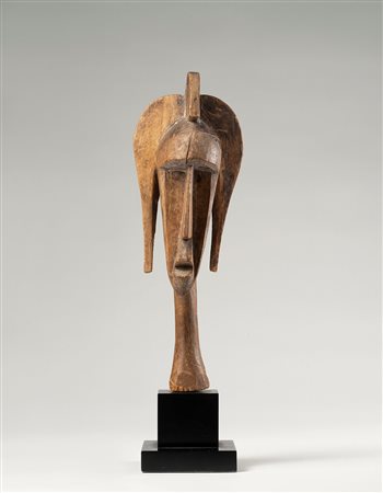 Maschera in miniatura ad uso divinatorio con la funzione di ricettacolo degli spiriti delle grandi maschere non più in uso. Nella parte posteriore è stato inserito un ricettacolo ripieno di sostanze a carattere magico chiuso con iuta e rifinito con una fila di Cypree. Un lungo ferro infisso sotto il mento serviva per piantare la maschera nel terreno per il suo utilizzo nei rituali di divinazione. Un lungo tessuto indigeno avvolge tutt'intorno la maschera.