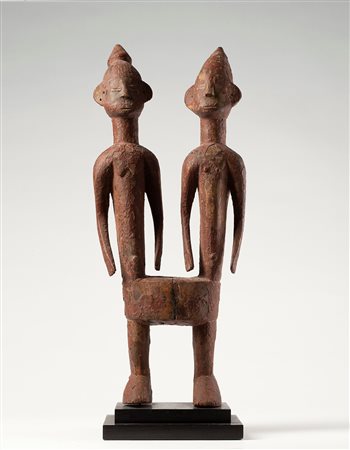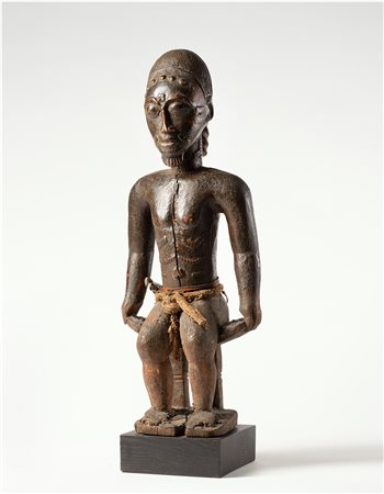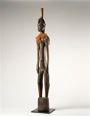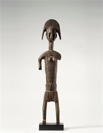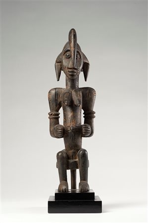 Scultura maschile scolpita secondo i criteri stilistici diffusi tra gli scultori Senufo della regione di Sikasso. Sulla testa è presente il “Calao”, l’uccello emblematico dei Senufo, il volto è segnato da un naso allungato collegato alle arcate sopraccigliari, occhi socchiusi, labbra e orecchie sporgenti. Dal corpo longilineo sporgono le lunghe braccia con le mani appoggiate alle cosce. La figura è sostenuta da un grosso zoccolo e sulla testa spunta la maniglia di tenuta che permette di sollevare e battere la scultura sul terreno. La patina chiara sui punti di contatto denota un utilizzo prolungato.