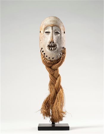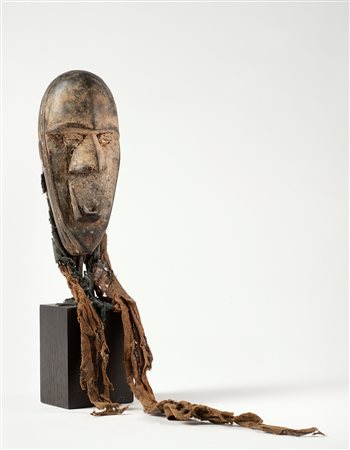 Lo stile di questa maschera conferma la tradizione dell’arte Lega: volto di forma ovale con l’area del viso concava, in contrasto con la superficie convessa in cui è inscritta. Gli occhi sono sottili fessure in rilievo, il naso sporgente divide in due parti l’area del viso, la bocca mostra file di denti aguzzi. Intorno alla faccia è legata una lunga barba di fibre intrecciate.