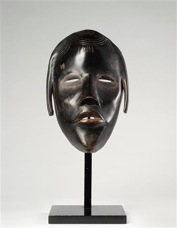 Maschera che rappresenta la sintesi perfetta del volto idealizzato di un’antenata del clan. E’ scolpita in legno duro e rispetta la tradizione delle maschere Dan classiche.Le parti del viso sono eseguite con delicatezza: mento a punta, naso e labbra ben proporzionati, occhi a fessura segnati da pigmento bianco, superficie del legno levigata con sfregamenti di foglie abrasive. La lucentezza brillante della patina è stata ottenuta con l’immersione in una soluzione di foglie macerate in acqua e polvere di nero fumo. Alla fine, una volta asciutta, la maschera veniva strofinata a lungo finché la superficie non diventava lucida. E’ un risultato estetico molto apprezzato dai collezionisti.