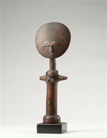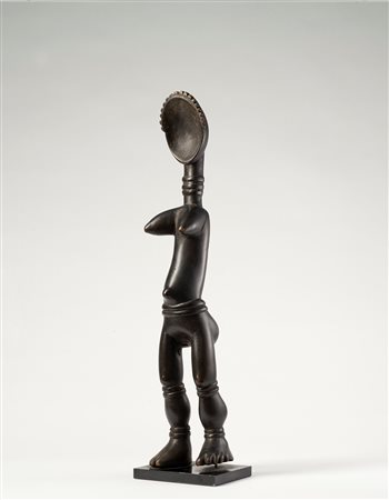 Questo esemplare - un capolavoro di equilibrio e fantasia - è costituito dalla pala concava che rappresenta la testa di una figura umana sostenuta da un corpo stilizzato privo delle braccia. Il tronco mostra seni abbondanti e ombelico prominente, le gambe ben modellate e rifinite fino ai piedi completano la figura. Tutto il corpo è impreziosito da anelli in rilievo. Le rappresentazioni dei cucchiai, per la genialità delle soluzioni che gli scultori africani hanno trovato, costituiscono un insieme organico di opere d’arte entrate a pieno titolo nelle grandi collezioni e nei musei del mondo.