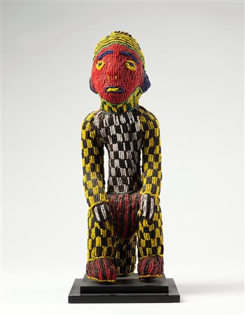 Rappresenta l’immagine stilizzata di un persona di alto rango nella gerarchia del popolo Kuba. La ricca acconciatura e i raffinati tatuaggi del corpo testimoniano l’importanza della donna. I disegni geometrici che decorano la sua figura sono caratteristici della tradizione Kuba.