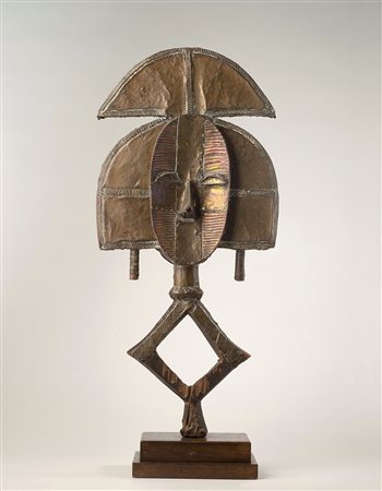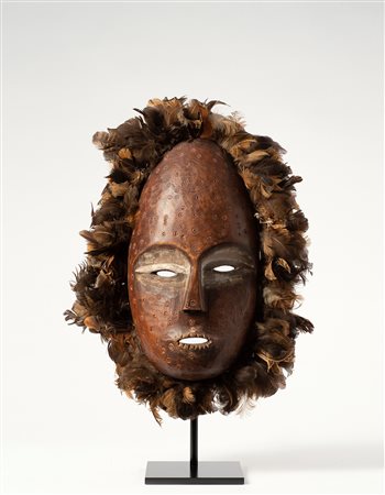Esemplare di grandi dimensioni che conferma la tradizione dell’arte Lega. Gli occhi a fessura sono messi in risalto dal bianco del caolino. La superficie del legno, ben levigata, presenta una complessa decorazione a piccoli cerchi con punto centrale, un dettaglio molto utilizzato nelle opere Lega. Sembra che il significato dei punti rappresenti la bellezza, il vigore dell’individuo e anche la forza vitale del sole. La corona di piume si riscontra in altri esemplari della società Bwame.