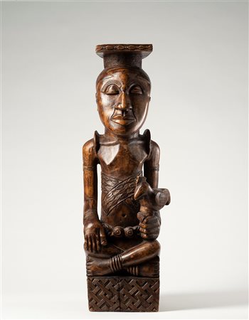 Esemplare raro nella rappresentazione stilistica dei Senufo di Korhogo. Katiéléo rappresenta la figura di una antenata primordiale del pantheon Senufo. Evoca la madre divina che detiene un ruolo sacro ed essenziale nella mitologia di questo gruppo. Si conoscono alcuni esemplari di figure simili che, sedute sul seggiolino, allattano un figlio.Le loro dimensioni raggiungono il metro di altezza. Qui la figura femminile di 33 cm è appoggiata seduta su un seggiolino a gamba unica. Il volto è parzialmente nascosto da un’esagerata ciocca di capelli che scende sul grosso naso: una caratteristica di queste opere. Occhi a bulbo e labbra piatte sporgenti segnano la geometria della faccia. I seni abbondanti sono un auspicio di fertilità. Le braccia staccate dal tronco, piegate sul ventre, sono abbellite con bracciali ai polsi e agli avambracci. La scultura è realizzata con una serie di volumi pieni che si alternano a vuoti: un lavoro di abilità dello scultore che ha segnato il corpo con raffinate scarificazioni. Il legno è ricoperto con una densa patina dovuta ai continui trattamenti con sostanze oleose.