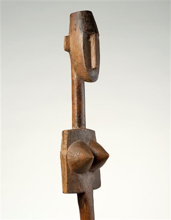 Rappresenta il busto di una figura femminile utilizzata come marionetta (Merekun). Scolpita secondo stilemi tipici dei Bambara il viso è inscritto in un ovale allungato che alla sommità diventa una linea orizzontale in corrispondenza della fronte ampia. Un lungo naso scende a sbalzo e divide in due parti il viso segnato da occhi circolari e caratterizzato da una porzione scura nella zona inferiore. Un collo cilindrico si innesta sul busto a spalle squadrate dove risaltano grossi seni a cono.In questo volto femminile sembra che lo scultore abbia voluto cogliere un’espressione malinconica. Qui risulta palese una azzardo stilistico che avrebbe influenzato i volti e i colli delle donne che Modigliani ha dipinto e scolpito.Ai lati delle spalle vi sono alcune rotture che la scultura ha subito nella sua lunga attività infatti le braccia mobili, ora scomparse, un tempo erano unite al corpo mediante grossi ganci di ferro. L’utilizzo di questa marionetta è palese per la patina liscia presente sul bastone dovuta al prolungato contatto umano.