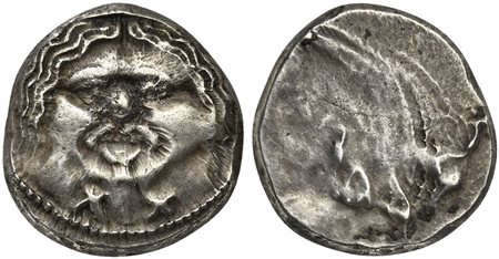 Lotto 2 Etruria, Populonia, 20 Asses, ca. 320-280 BC; AR (g 8,26; mm 19); Gorgoneion; below, X:X, Rv. No type. HNItaly 152; Vecchi 52.188 (this coin).