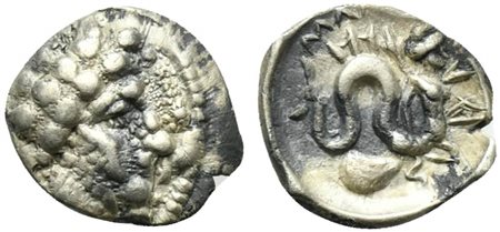 Lotto 24 Sicily, Abakainon, Litra, ca. 440-435 BC; AR (g 0,71; mm 12; h 6); ABAK, laureate and bearded male head r., Rv. AI - NI (around), boar standing r.; below, acorn. Bertino 6; Salinas I, 20; Campana 5.