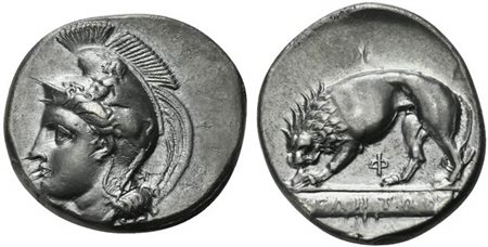 Lotto 9 Lucania, Velia, Didrachm of the Kleudoros group, ca. 334-300 BC; AR (g 7,54; mm 22; h 10); Head of Athena l., wearing crested Phrygian helmet decorated with sphinx; on r., monogram, Rv. YEΛHTΩN on raised tablet, lion tearing prey l.; below, Φ; above, letter or monogram. HNItaly 1294; SNG Ashmolean 1270 (same dies); SNG Lloyd 525 (same dies).