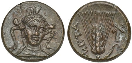 Lotto 15 Lucania, Metapontion, Bronze, ca. 300-250 BC; AE (g 4,15; mm 17; h 12); Head of Athena facing, slightly l., wearing triple crested helmet, Rv. META, barley ear; above, cross torch. HNItaly 1682; Johnston 46.
