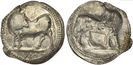 Lotto 17 Lucania, Sybaris, Stater, ca. 550-510 BC; AR (g 8,16; mm 30; h 12); Bull advancing l., looking backwards; in ex. MV (retrograde), Rv. Same type incuse without legend. HNItaly 1729.