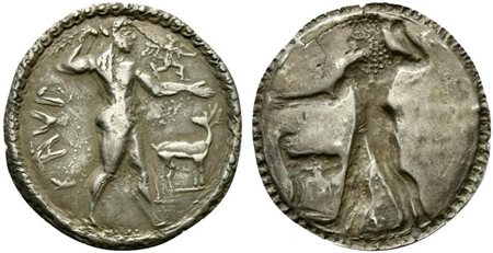 Lotto 18 Bruttium, Caulonia, Nomos, ca. 525-500 BC; AR (g 6,55; mm 31; h 12); KAVΛ, Apollo, diademed, walking r., holding laurel branch in upraised r. hand and small running daimon, holding long branch on outstretched arm; in r. field, stag r. on platform, Rv. The same type incuse l., without legend, laurel branch and daimon. HNItaly 2035.