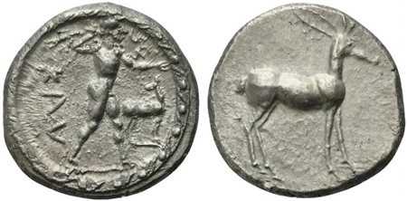 Lotto 19 Bruttium, Caulonia, Stater, ca. 475-425 BC; AR (g 8,05; mm 22; h 12); KAV, Apollo naked, advancing r., holding a branch in uplifted r. hand and a small naked running figure or daimon on outstretched l. arm; on r., stag standing r. and looking backwards, Rv. Stag standing r. HNItaly 2044.