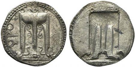 Lotto 20 Bruttium, Croton, Stater, ca. 530-500 BC; AR (g 8,11; mm 27; h 12); ϘPO, tripod with ornaments and legs ending in lion's paws; below, two serpents, Rv. Same type incuse without legend. HNItaly 2075.