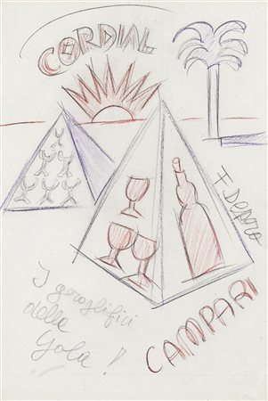 Lotto 4 Fortunato Depero (Fondo 1892 – Rovereto 1960) Cordial Campari. I geroglifici della gola. 1930-31;Matite colorate su carta, 24,8 x 17 cm