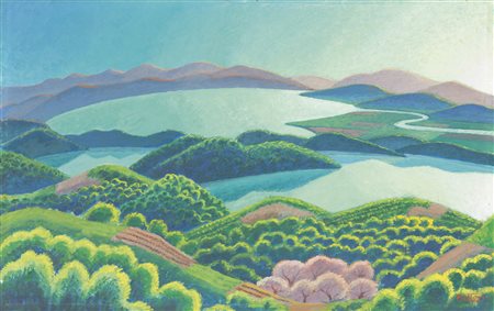 una veduta di paesaggio collinare umbro, in cui si inseriscono alcuni laghi idealizzati secondo il consueto linguaggio dottoriano, come