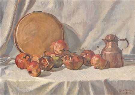 Lotto 16 Lina Rosso (Venedig/Venezia 1888 – 1975) Rame e melograni, 1937;Olio su tavola, 54 x 75,3 cm, al retro firma, data e luogo