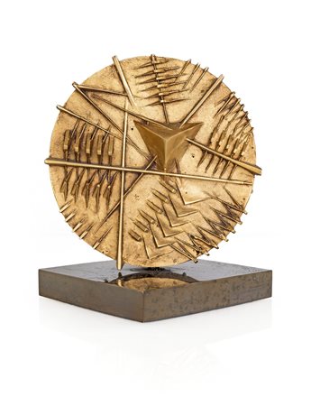 Lotto 1 Arnaldo Pomodoro, Ruota I per Alfa Romeo, 1984 Scultura in bronzo dorato diametro 15 cm (base in ottone brunito cm 2x15x15