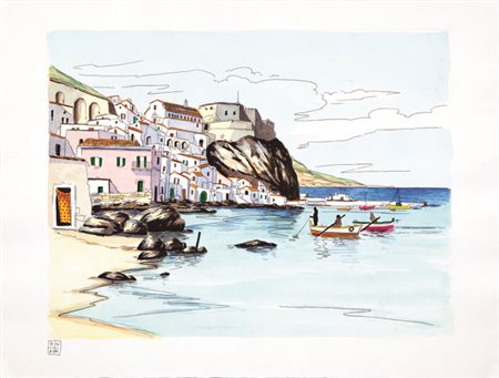 Lotto 7 ALDO RISO(SANTA MARIA DI LEUCA 1927)'Chianalea di Scilla'incisione acquerellata a manocm 60x80firmata in basso a sinistratimbro a secco Grafica d'Arte Lombardi