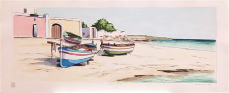 Lotto 9 ALDO RISO(SANTA MARIA DI LEUCA 1927)'Casa del pescatore'incisione acquerellata a manocm 40x100firmata in basso a sinistratitolata al centrotimbro a secco Grafica d'Arte Lombardi