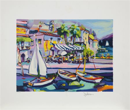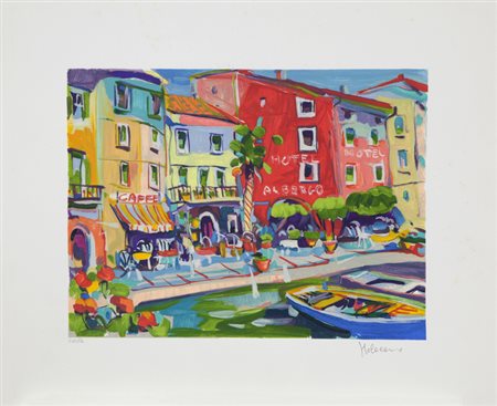 Lotto 14 CLAUDIO MALACARNE(MANTOVA 1956)'Porticciolo'serigrafia polimaterica su cartacm 45x55 esemplare n.XIX/Cfirmata in basso a destra numerata in basso a sinistra al retro etichetta della Stamperia dell'Arancio - Grottammare