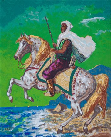 Lotto 17 GIAN FRANCESCO GONZAGA(MILANO 1921 - MILANO 2007)'Cavaliere Berbero'serigrafia polimaterica su tessuto broccatoanno 1998esemplare n. 29/150cm 50x40firmata in basso a destranumerata in basso a sinistaal retro: certificato di autenticit‡ rilasciato daSpirale 2000 Srl
