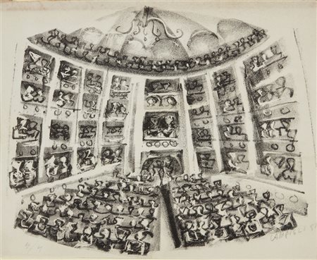 Lotto 1 CAMPIGLI MASSIMO (1895 - 1971) Teatro II. 1951. Litografia. Cm 17,50 x 14,00. 4/4. Tiratura, firma e anno in basso a matita. Lievi difetti. In basso a sinistra riporta una tiratura a matita (4/4) non presente sul catalogo generale. Pubblicazioni: Campigli Catalogo dell'opera grafica 1930 - 1969, Edizioni Graphis Arte, a cura di Francesco Meloni e Luigi Tavola, p.120 tav.145. Cornice presente