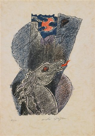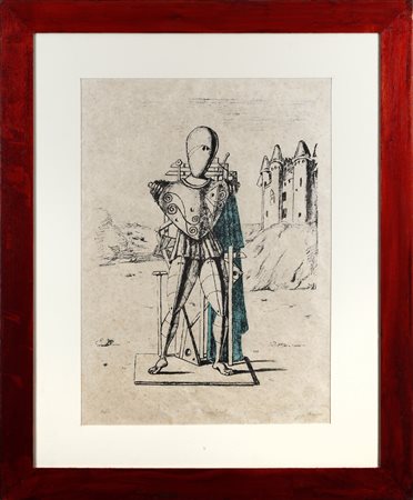 Lotto 4 DE CHIRICO GIORGIO (1888 - 1978) E gli fu data una grande spada. 1941. Litografia ritoccata a mano. Cm 27,00 x 35,00. Titolo in basso al centro. Firma a matita in basso a destra. Foglio proveniente dal volume 'L'Apocalisse', Edizioni della Chimera, Milano. Stampatore: Officina d'Arte grafica A.Lucini & C. Pubblicazione: Catalogo ragionato dell' Opera grafica 1921 - 1969, Edizioni Bora, Bologna, 1996, pag. 160 tav.108. Certificato di autenticità di FBArte. Lievi difetti. Cornice presente