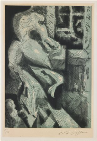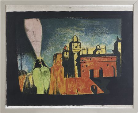 Lotto 3 DE CHIRICO GIORGIO (1888 - 1978) Il trovatore. Terza versione: manto verde. 1969. Litografia su carta di riso. Cm 53,50 x 70,50. P.d.a. Tiratura , titolo e firma in basso a matita. Timbro a secco Alberto Caprini, Roma, in basso a destra. Edizione totale: 60 esemplari numerati da 1/60 a 60/60; 15 esemplari numerati da I/XV a XV/XV; 21 esemplari su carta Japon siglati con le lettere da A a Z + p.d.a. Pubblicazioni: Giorgio De Chirico, Catalogo dell'opera Grafica 1969 - 1977, Edizioni Bora, a cura di Edoardo Brandi, pag. 83, tav.65. Berenice, Torino 1975; W.Schmied, Aosta 1981; F.Sìmongini - A De Angelis, Roma 1989; F.Ulivi, Ischia 1989, Policoro 1990; D. Guzzi - R.Dottori, Colonnella, 1998. Difetti. Cornice presente