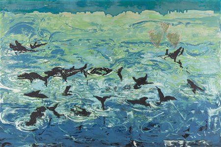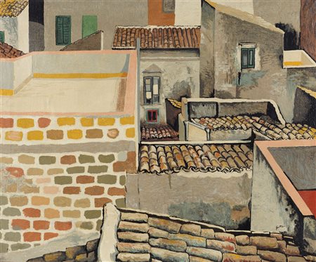 Lotto 24 GUTTUSO RENATO (1912 - 1987) Tetti di Bagheria. oleografia su tela. Cm 145,00 x 123,00. P.a. Tiratura e firma in basso. Difetti. Cornice presente