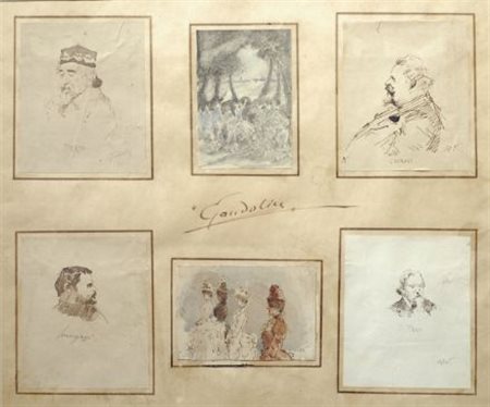 Lotto 6 Anonimo del XIX sec. Quattro caricature e due studi per composizioni China; China e acquerello, cm. 12x10 (le quattro caricature); cm. 8x11(i due studi) Sei opere incorniciate in un'unica composizione, quattro fogli sono siglati: "A.V."