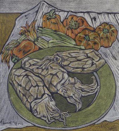 Lotto 9 Anonimo del XIX sec. Natura morta con seppie Pastelli su carta, cm. 26x24 Firma illeggibile in basso a sinistra.