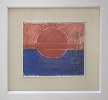 Lotto 10 Bruno Saetti, Paesaggio con sole, Fine anni sessanta, affresco su tela, cm 30x35. Autentica a cura di Archivio storico artisti veneti.
