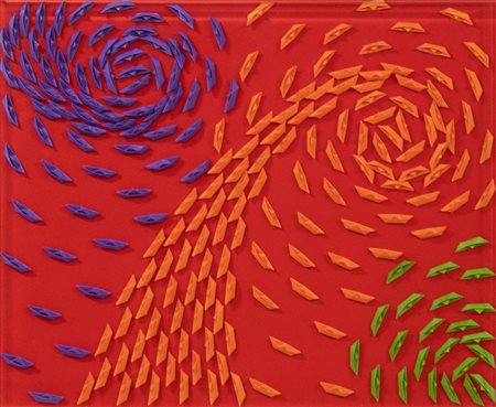 Lotto 17 Riccardo Gusmaroli, Vortice rossa, 2019, barche di carta su tela, cm 45x55. Archivio Gusmaroli con codice 079.