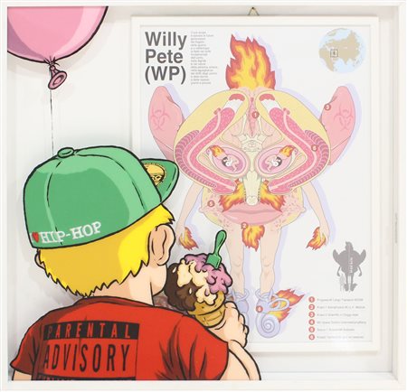 Lotto 18 Dario Arcidiacono, Willy pete, 2010, acrilico su plexiglas, cm 70x70. Autentica a cura dell'artista. Opera pubblicata su catalogo 'Pamir MHD 3.2. La macchina che provoca gli tsunami e i terremoti, e altre storie'.