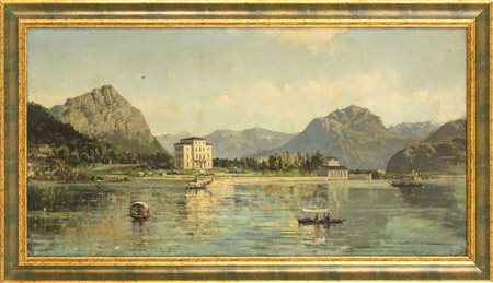 Veduta di lago alpino, con barche e una villa sullo sfondo