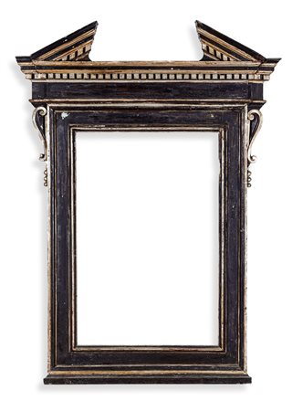Lotto 1 Cornice ad edicola in legno ebanizzato con profili dorati a mecca. Italia centrale XVI-XVII secolo, profilo architettonico con parte superiore a timpano spezzato e decoro a dentello, , cm 168x123 luce cm 99,5x65,8