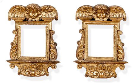 Lotto 7 Coppia di cornici in legno dorato. Roma XVII secolo, battuta liscia a linea spezzata, profilo esterno arricchito alla base di ciascun lato verticale da una voluta fogliata scolpita, base idealmente sorretta da una sorta di mensola a ricciolo di voluta intagliata, cimasa centrata dal volto di un cherubino alato lievemente aggettante, cm 39,5×29,5 luce cm 17×13,5