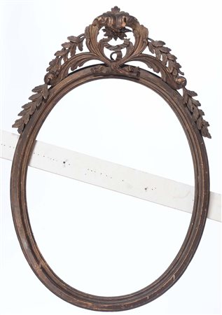 Lotto 13 Cornice ovale in legno intagliato. Piemonte XVIII secolo, ricca cimasa finemente intagliata a motivi vegetali e foglie, cm 113x75 luce cm 83x65