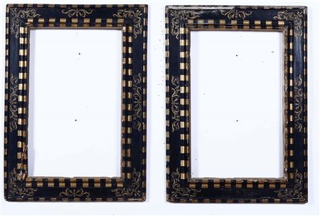 Lotto 20 Coppia di cornici a cassetta in legno ebanizzato e dorato.Siena XVI-XVII secolo, angoli e centri dorati a racemi, cm 96x67,5 luce cm 70x43,5