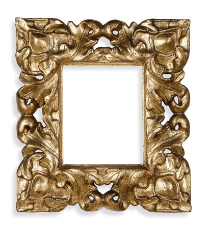 Lotto 21A Cornice in legno intagliato e dorato. Toscana XVII secolo, battuta liscia contornata da fascia intagliata con motivi di foglie, cm 31x28 luce cm 16x12,5