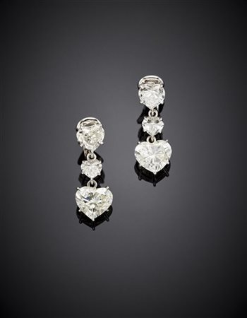 Orecchini pendenti in oro bianco con sei diamanti a cuore per complessivi ct. 5,20 circa, i diamanti principali di ct. 1,70 circa e di ct. 1,74 circa, g 5,57 circa, lungh. cm 2,40 circa. Firmati Pederzani.