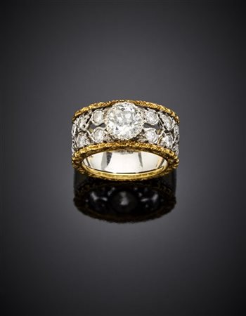 Bi-coloured chiseled gold ring with an old mine ct. 1.15 circa diamond accented with smaller diamonds, g 9.51 circa size 13/53. (possible fissure infiltration) -
